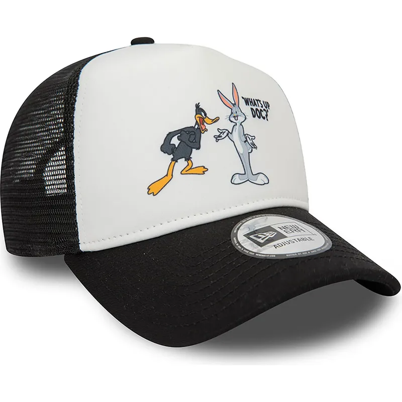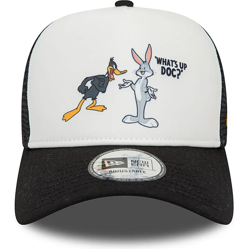 Biało-czarna czapka typu trucker A Frame Character z Królikiem Bugsem i Kaczorem Daffy Looney Tunes marki New Era stanowi idealne uzupełnienie każdego swobodnego i zabawnego stroju. Ta czapka New Era ma design unisex, który doskonale łączy klasyczny styl truckera z kultowymi postaciami ze Looney Tunes, Królikiem Bugsem i Kaczorem Daffy'm.